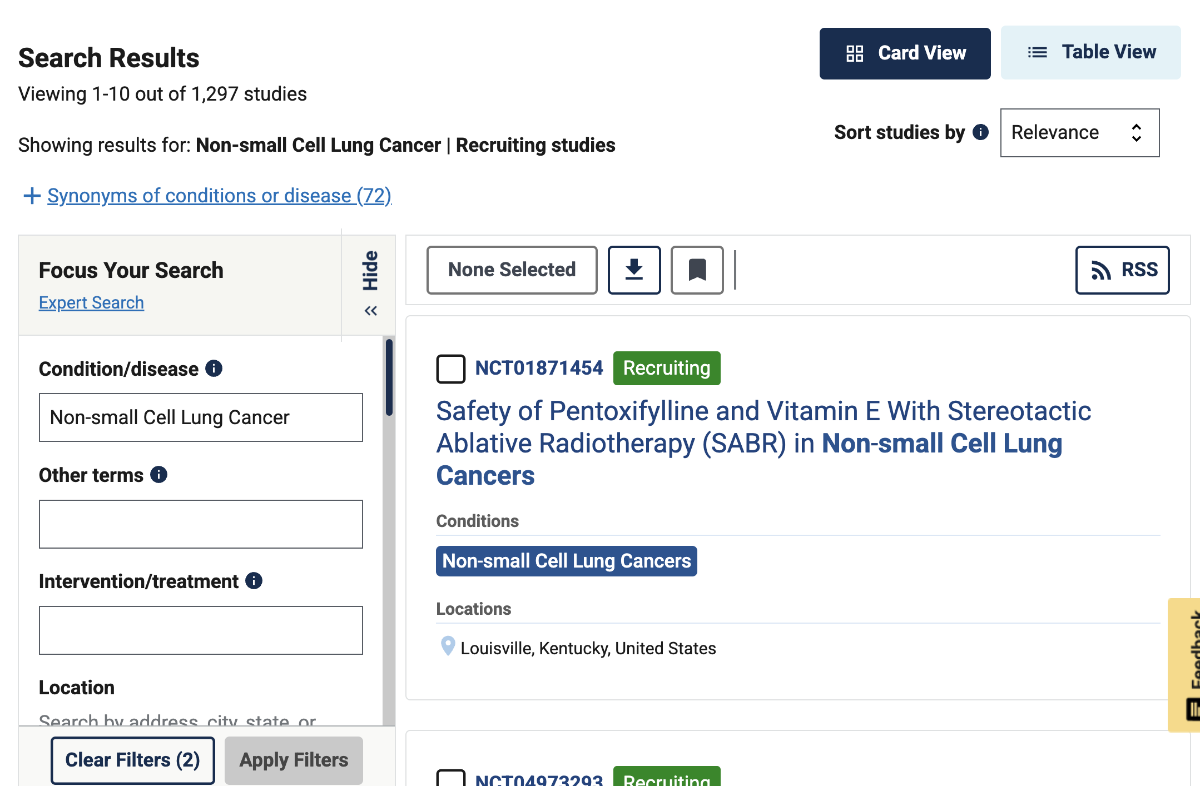 Patient Searches Independently: Several websites, like ClinicalTrials.gov, are great resources and contain a lot of information (in fact, TrialFetch is built partially on data from ClinicalTrials.gov). But this information is very hard for patients to make use of. You can search for trials for breast or lung cancer, but then hundreds of trials show up in no particular order: