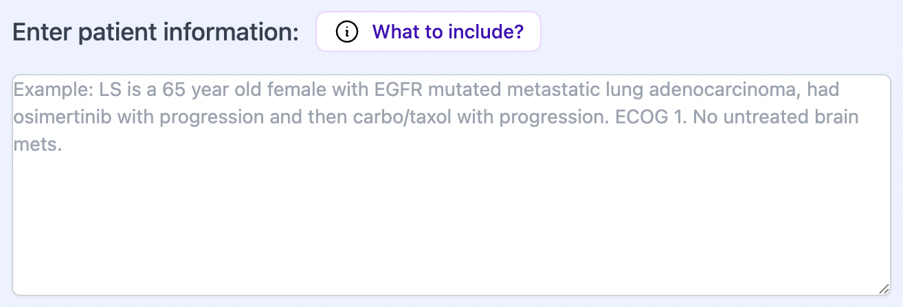 Use the Free Text input to simply type in the patient's information in natural language. Our AI will process it and convert it into the structured format needed to match the trials. Because AI technology is not perfect, you have a chance to review the information for accuracy before seeing the matched trials.