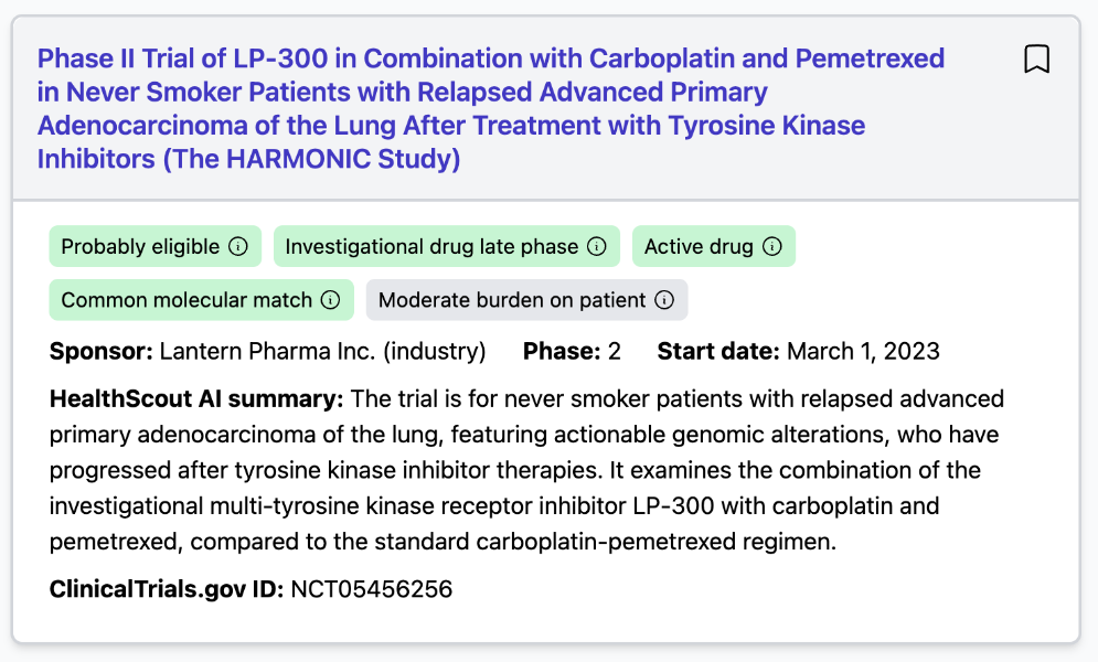 Just as important as knowing if a patient is eligible based on the criteria is whether the trial is actually a good fit for them. We use AI to get detailed information and analysis for each trial. This lets us put the trials that are the best match for the patient at the top of the list. Important features include: